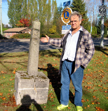 Mile 35 is just east of 264th Street in Aldergrove - very visible was facing the wrong direction (as in picture with Wally) but has now been repositioned by Township of Langley