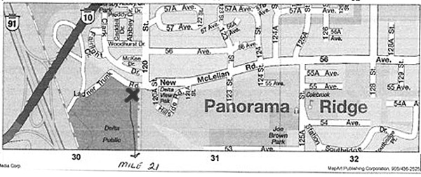 A Mile 21 marker in Panorama Ridge is shown on the right and is kept up by the Delta municipality.